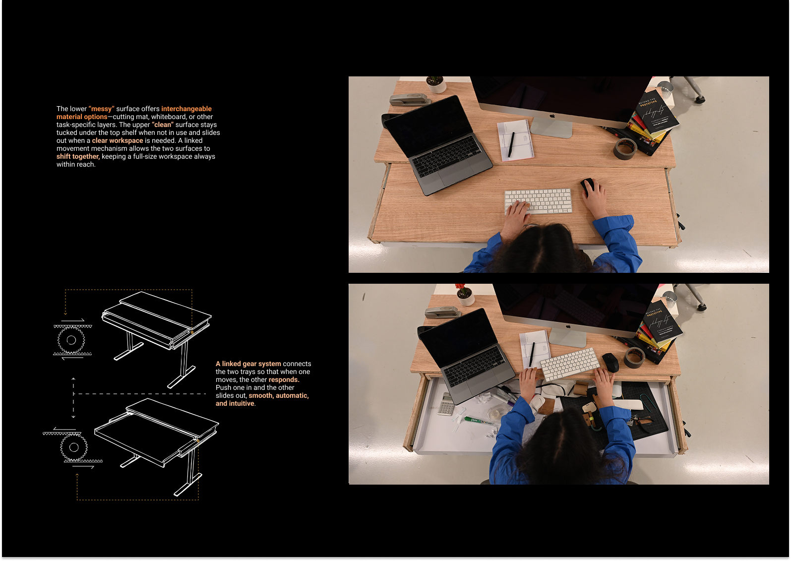 Desk.zip is a spatial interface for people who work across multiple modes — digital, analog, and hands-on. Instead of forcing users to clear space every time they switch tasks, the desk introduces a three-tier sliding system that behaves like switching between tabs on a computer: fast, clean, and continuous.