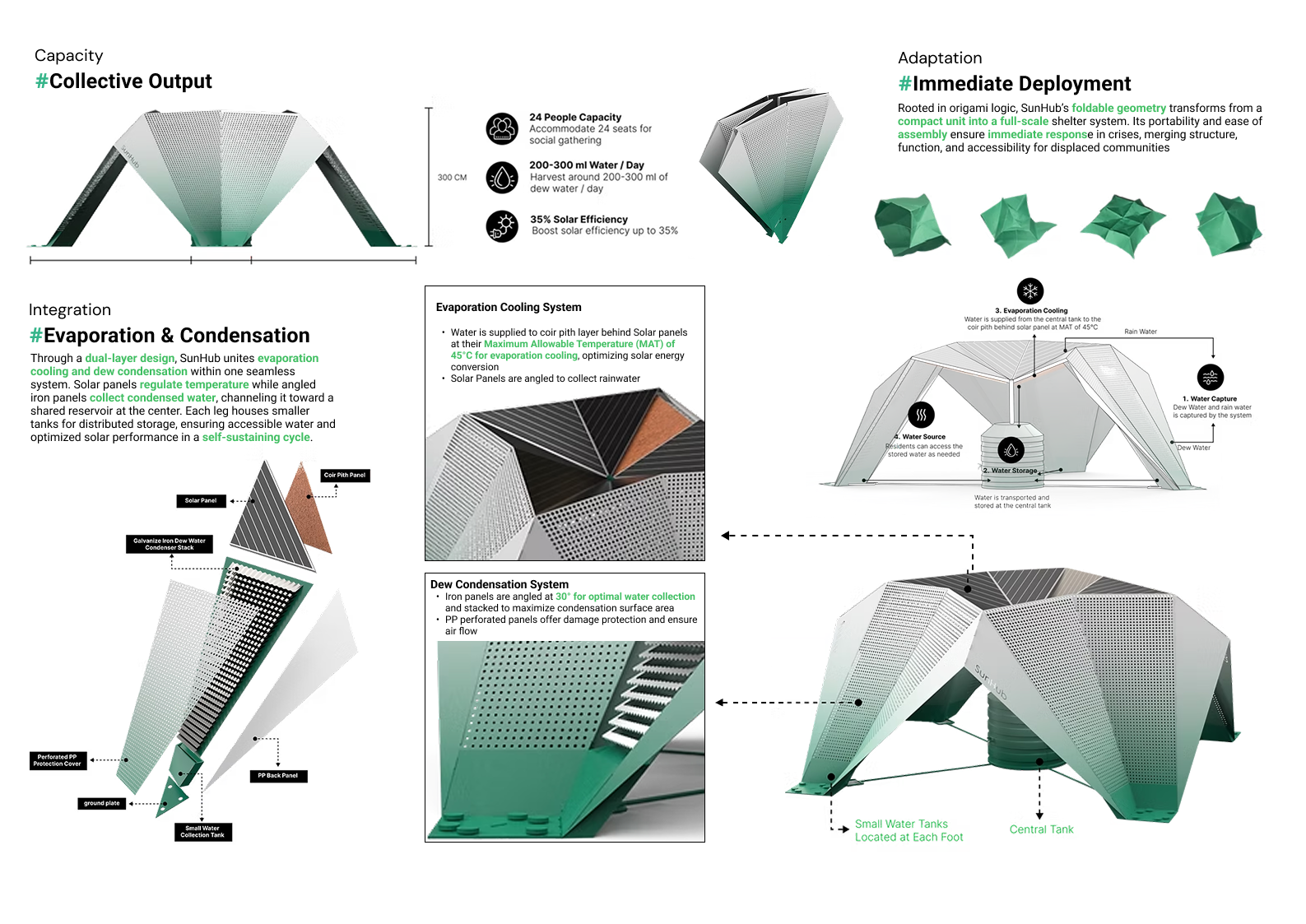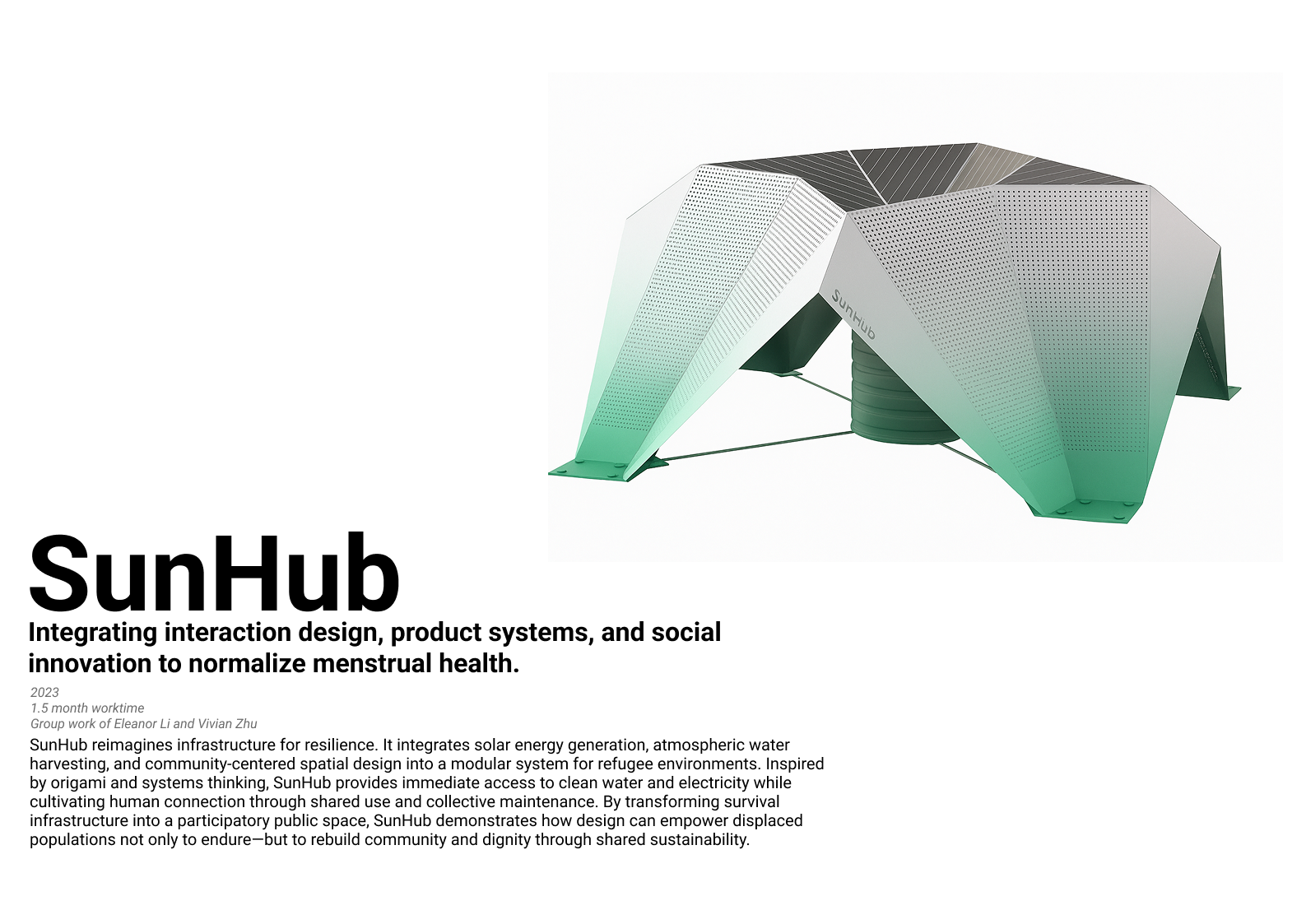 SunHub reimagines infrastructure for resilience. It integrates solar energy generation, atmospheric water harvesting, and community-centered spatial design into a modular system for refugee environments. Inspired by origami and systems thinking, SunHub provides immediate access to clean water and electricity while cultivating human connection through shared use and collective maintenance. By transforming survival infrastructure into a participatory public space, SunHub demonstrates how design can empower displaced populations not only to endure—but to rebuild community and dignity through shared sustainability.